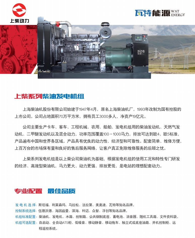 The power part of the Shangchai diesel generator set uses Shanghai Diesel Co., Ltd.’s land-based power generation series diesel engines. Shanghai Diesel Engine Co., Ltd., formerly known as Shanghai Diesel Engine Factory, independently designed and manufactured China’s first 6135 diesel engine in 1958, pioneering the development of medium bore diesel engines in China and establishing the company’s fundamental position in the industry. The company currently has three major series of diesel engines, D114, C121, and 135 (G128), with a power coverage range of 60-420 horsepower. The product is mainly used for power matching in commercial vehicles, engineering machinery, ships, and self owned power stations, and is exported to more than 50 countries and regions.